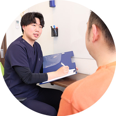 当院では先ずはカウンセリング時に患者様の声をしっかりと聞くことを心掛けています。いつどこでどうなったかを詳しく聞くことでその後の施術も変わってきます。